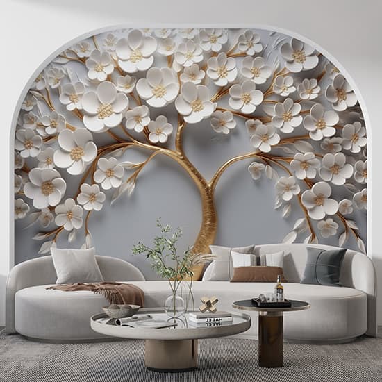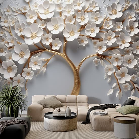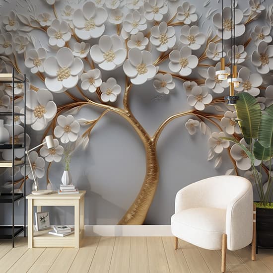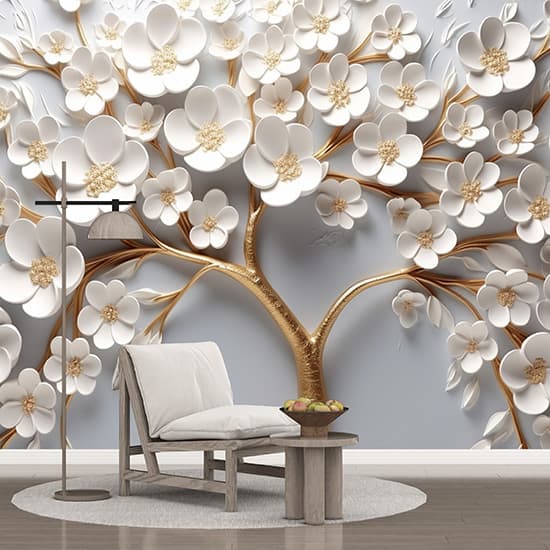 3D Çiçekli Duvar Kağıdı, Gold ve Beyaz Çiçekler ve Ağaç YF-02398