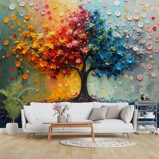 3D Rengarenk Ağaç Duvar Kağıdı, Renkli Çiçekli Yağlı Boya Posteri YCO-30010
