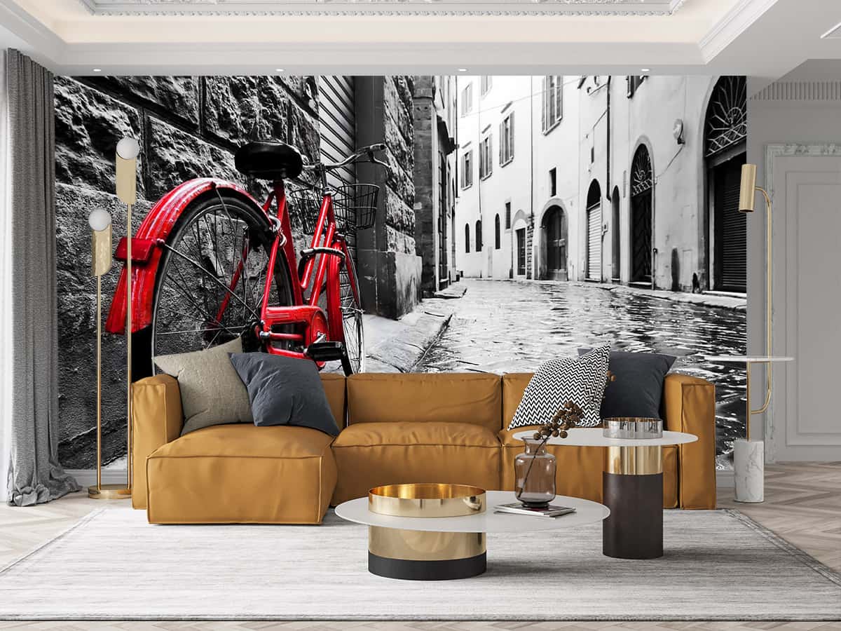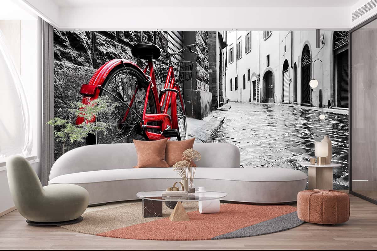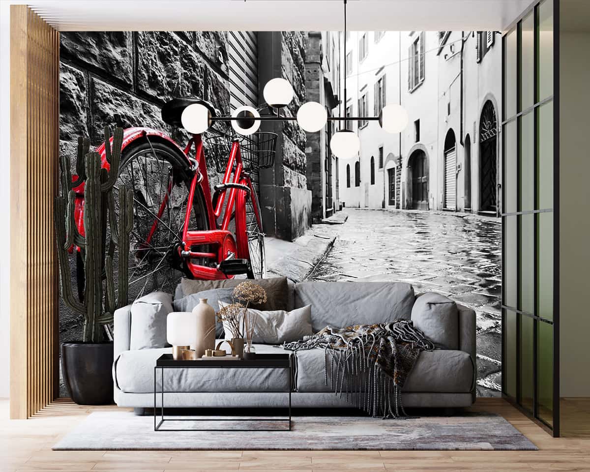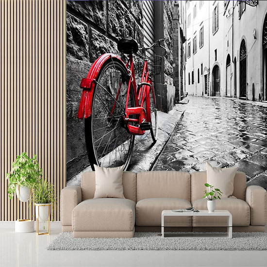 Duvar Kağıdı Arnavut Kaldırımı Sokakta Kırmızı Bisiklet F1235