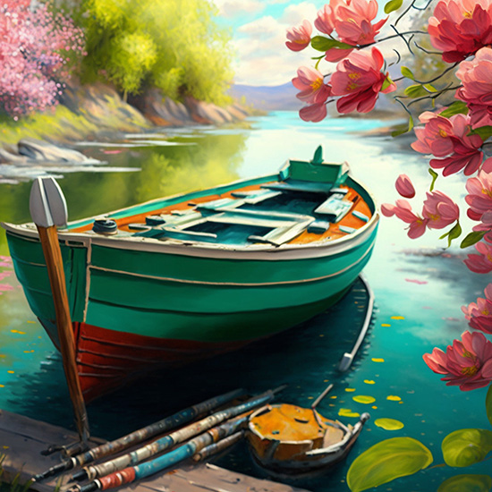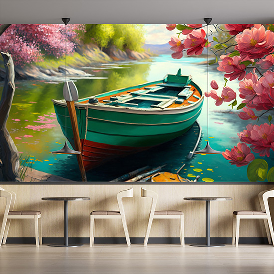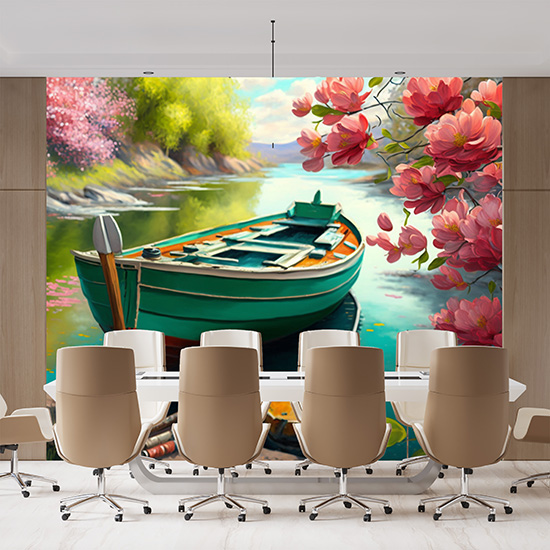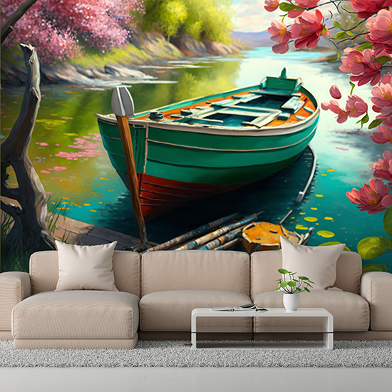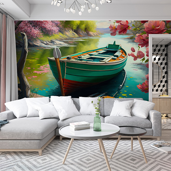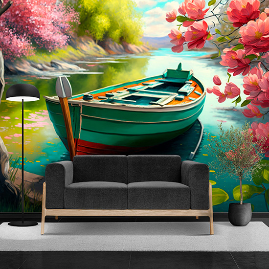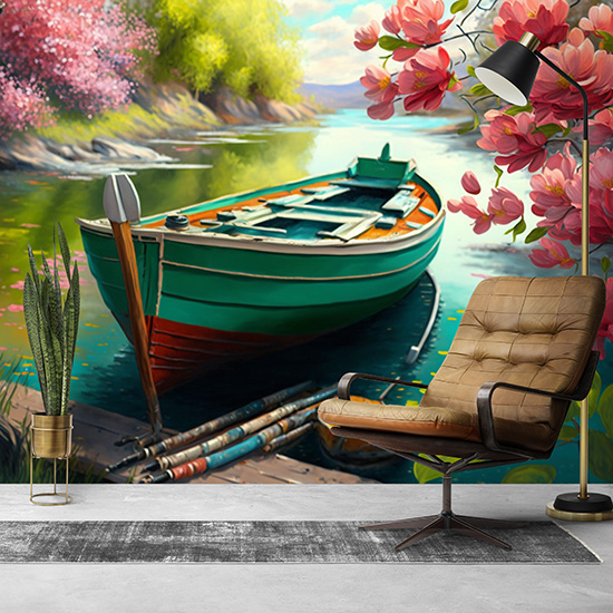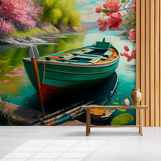 Göldeki Kayık ve Çiçek Açmış Ağaçlar Duvar Kağıdı YD-00404