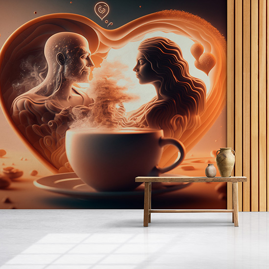 Kadın Erkek ve Kalpli Kahve İllüstrasyon Cafe Duvar Kağıdı YC-00190